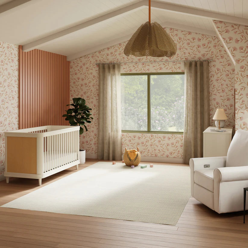 Ease into contemporary style with the Marin 3-in-1 Convertible Crib. Featuring a gently curved silhouette with solid rounded cane side panels, the Marin is an effortlessly transitional piece for the home. Crib converts to a toddler bed and daybed, and fits any standard full-size crib mattress.