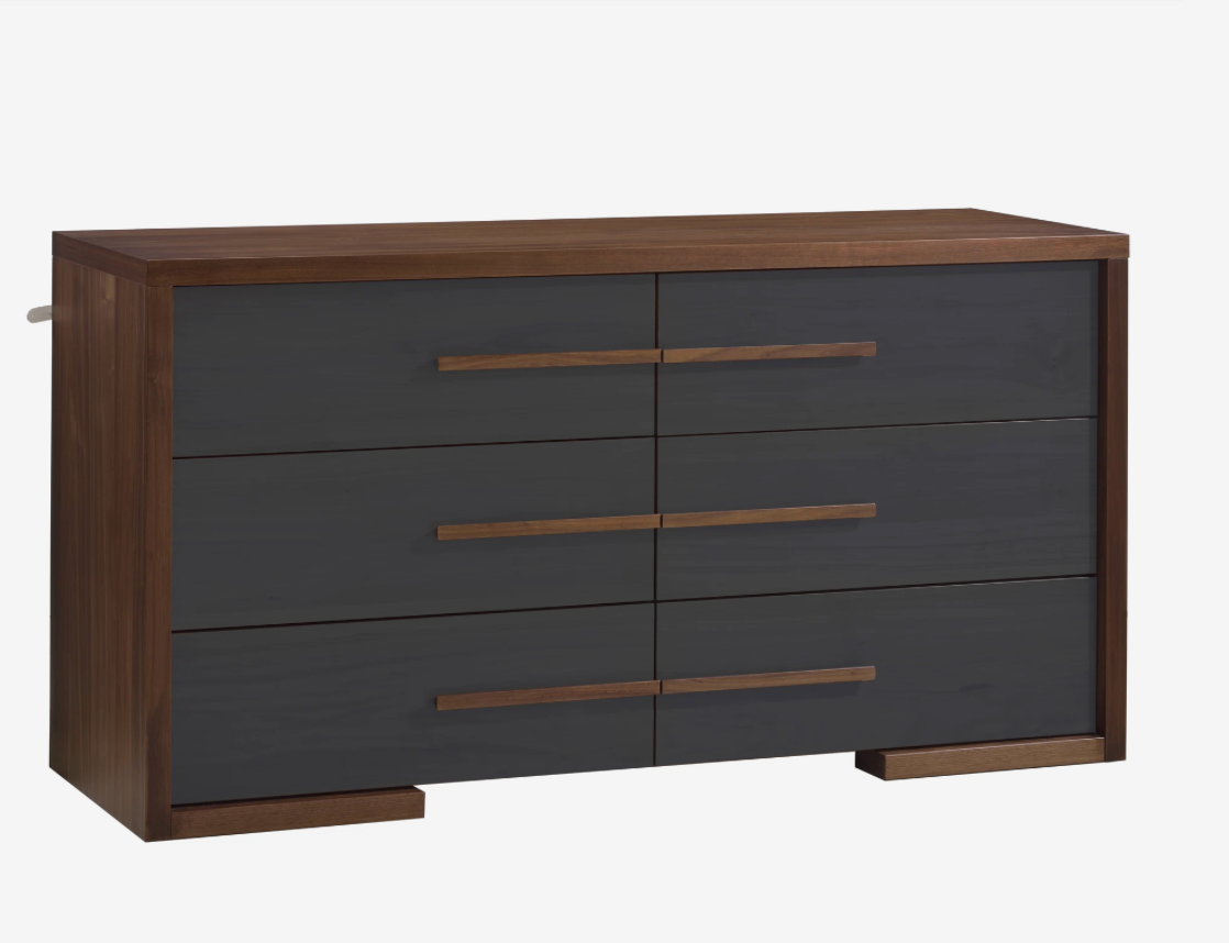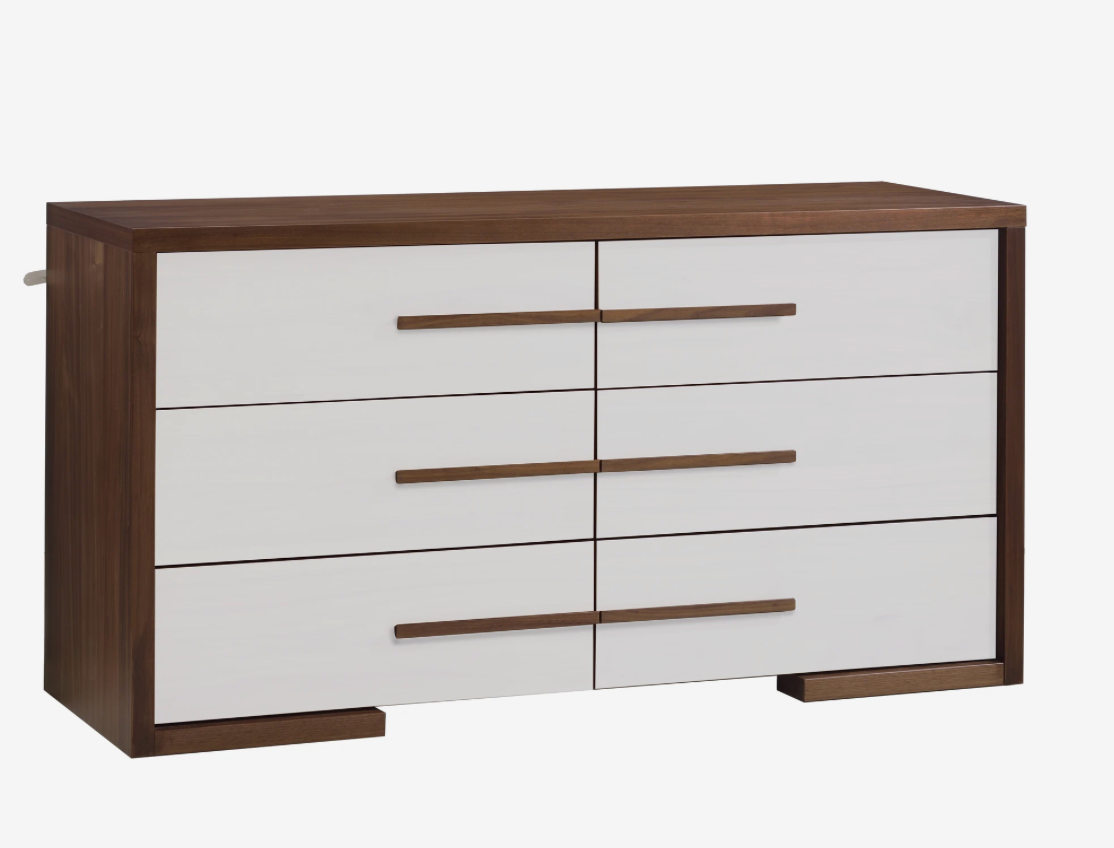The Natart Aria 62" Double Dresser delivers a perfect balance of modern elegance, superior durability, and industry-leading safety. Expertly crafted in Canada from solid walnut wood, this dresser showcases a warm, luxurious aesthetic paired with clean lines and custom walnut handles for a refined, minimalist look that complements any contemporary nursery or bedroom.