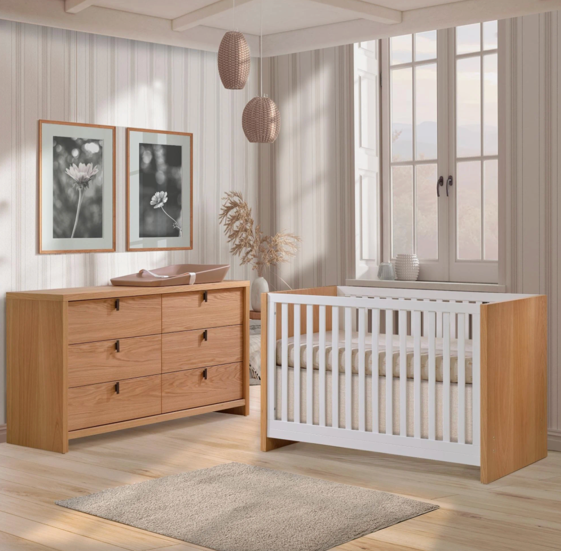 The Natart Linea Double Dresser 62’’ combines modern Scandinavian-inspired design with premium craftsmanship and the highest safety standards. Handcrafted in Canada from solid oak wood, this dresser features a clean, natural finish with unique vertical metal handles, adding a contemporary and sophisticated touch to any nursery or bedroom.