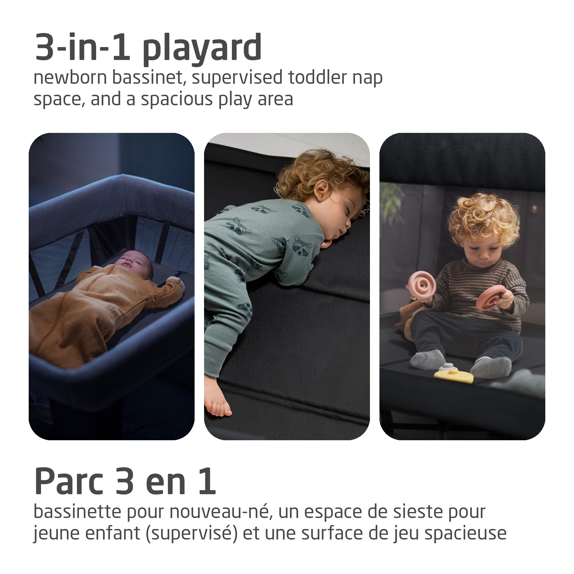 - 3-in-1 Play Yard: Featuring a newborn bassinet, toddler sleep space and space to play all-in-one.