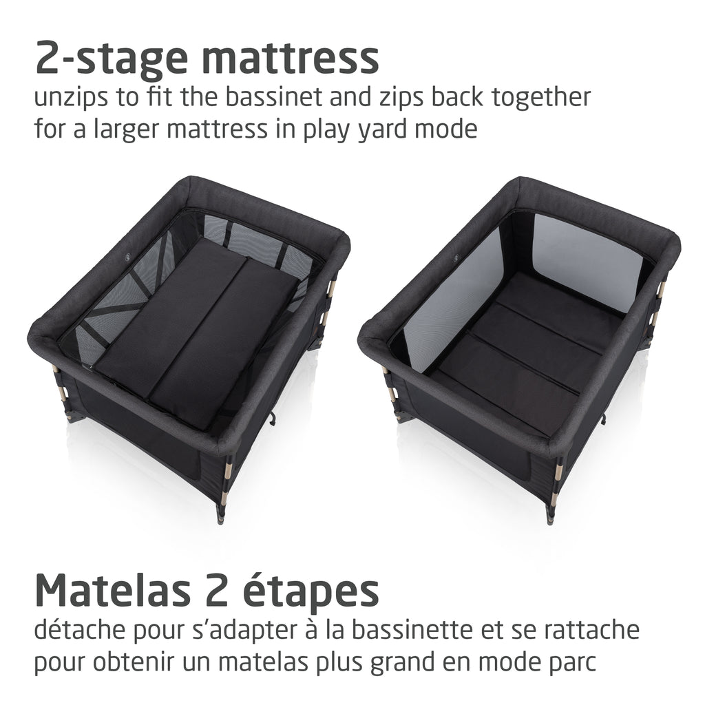 - Stage Mattress: This unique and comfortable mattress unzips to fit the bassinet and zips back together to create a larger mattress for the play yard.