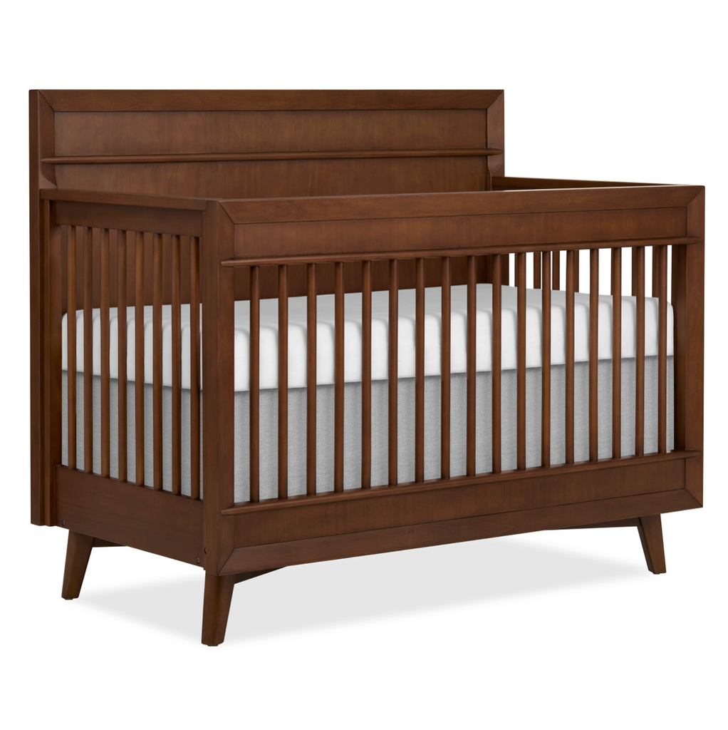 • Mid-Century Walnut Convertible Crib – A sleek, modern crib that transitions from crib to toddler bed with the included conversion rail, designed to grow with your little one.